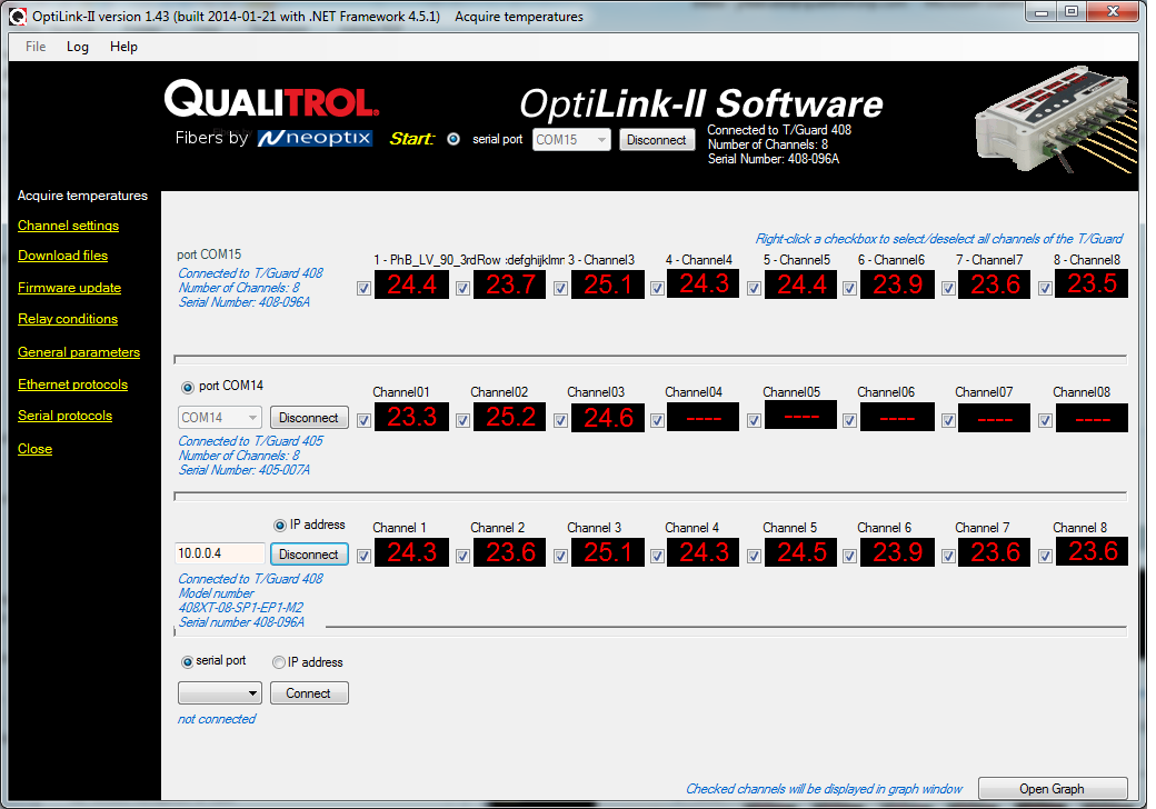 OptiLink-II prend simultanément en charge l’acquisition des données de températures pour 1 à 4 instruments indépendants interfacés sur 4 ports série différents (COM1 à COM32). Chacun de ces thermomètres est connecté au PC via des ports COM RS-232C, RS-485 ou encore un adaptateur série-USB.