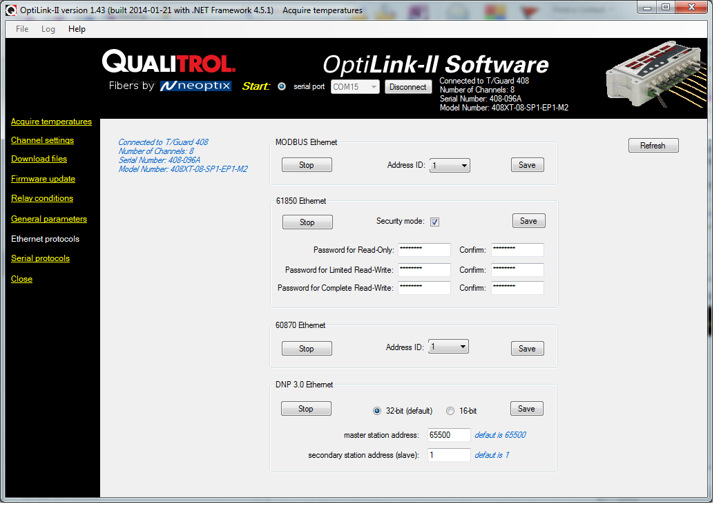 La configuration du système peut se faire par le clavier industriel de l'appareil, ou un logiciel utilisant le port série RS485 (OptiLink and OptiLink-II) ou encore un fureteur relié au serveur Web (408XT).